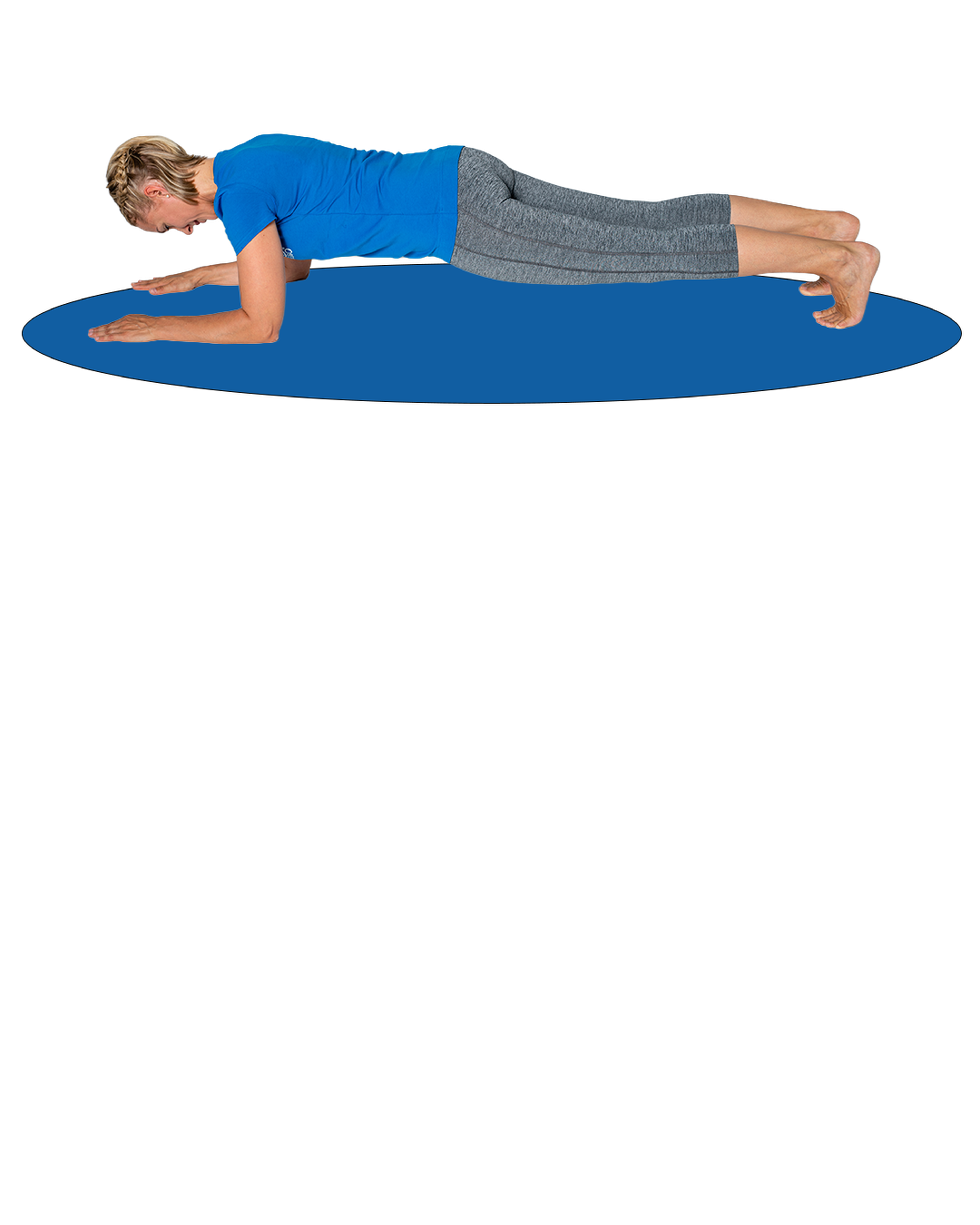 Du kommst in den Unterarmstütz, dein Körper bildet eine möglichst gerade Linie von Kopf bis zu den Fersen. Der Bauch hängt nicht durch, das Becken kippt nicht stark nach oben.