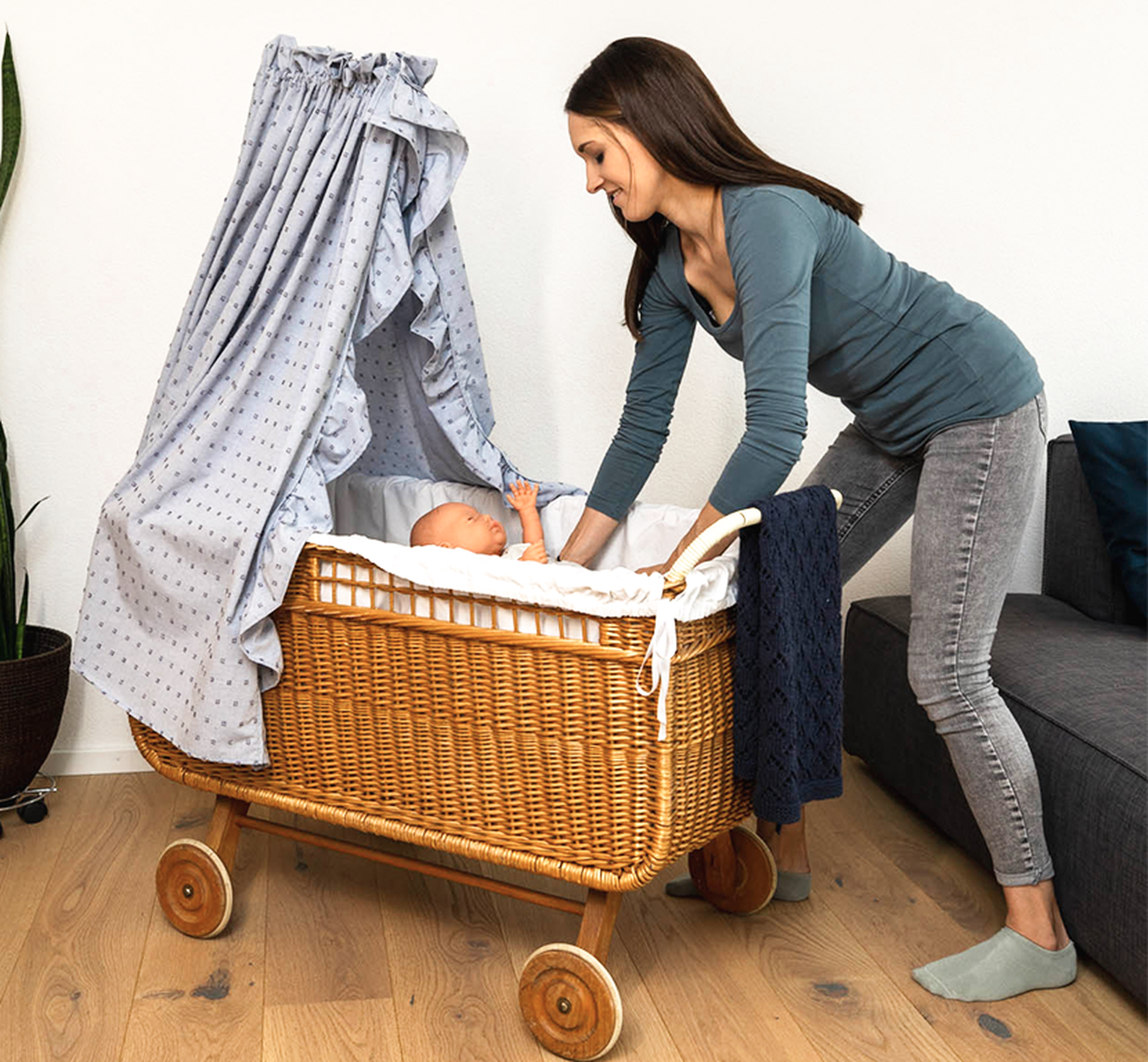 Statt dich einfach nach vorne zu beugen, beispielsweise beim Babyhochheben, nutze einen Ausfallschritt. Dabei spannst du den Beckenboden bewusst an und unterstützt das Heben mit einem lautem „Hopp!“